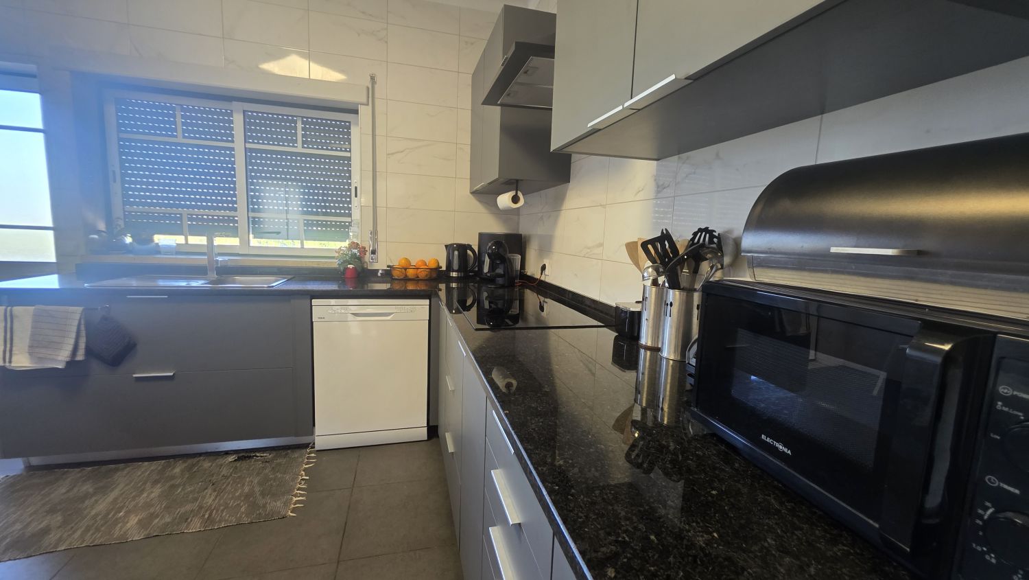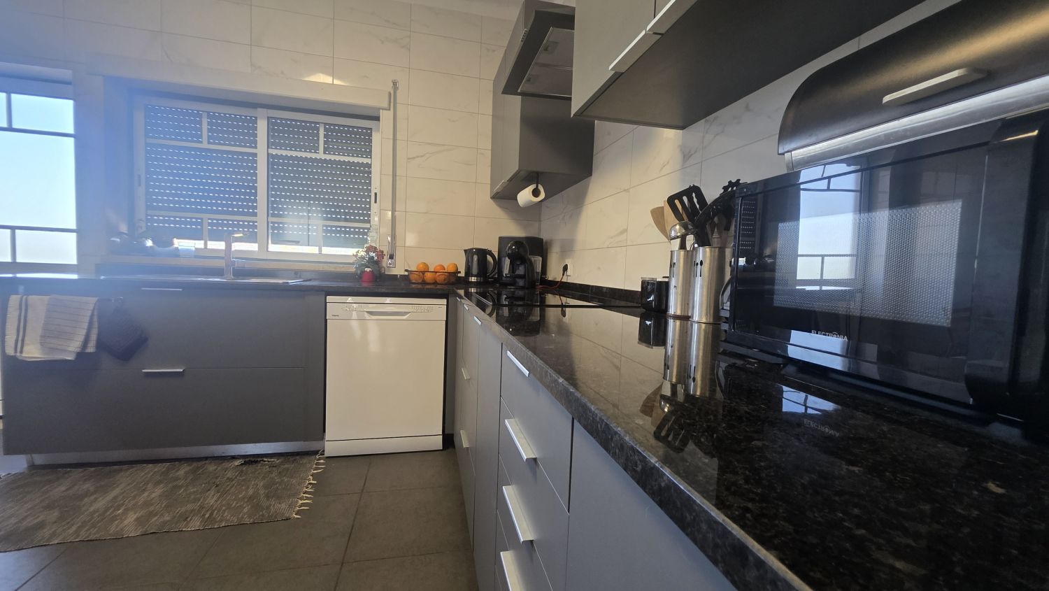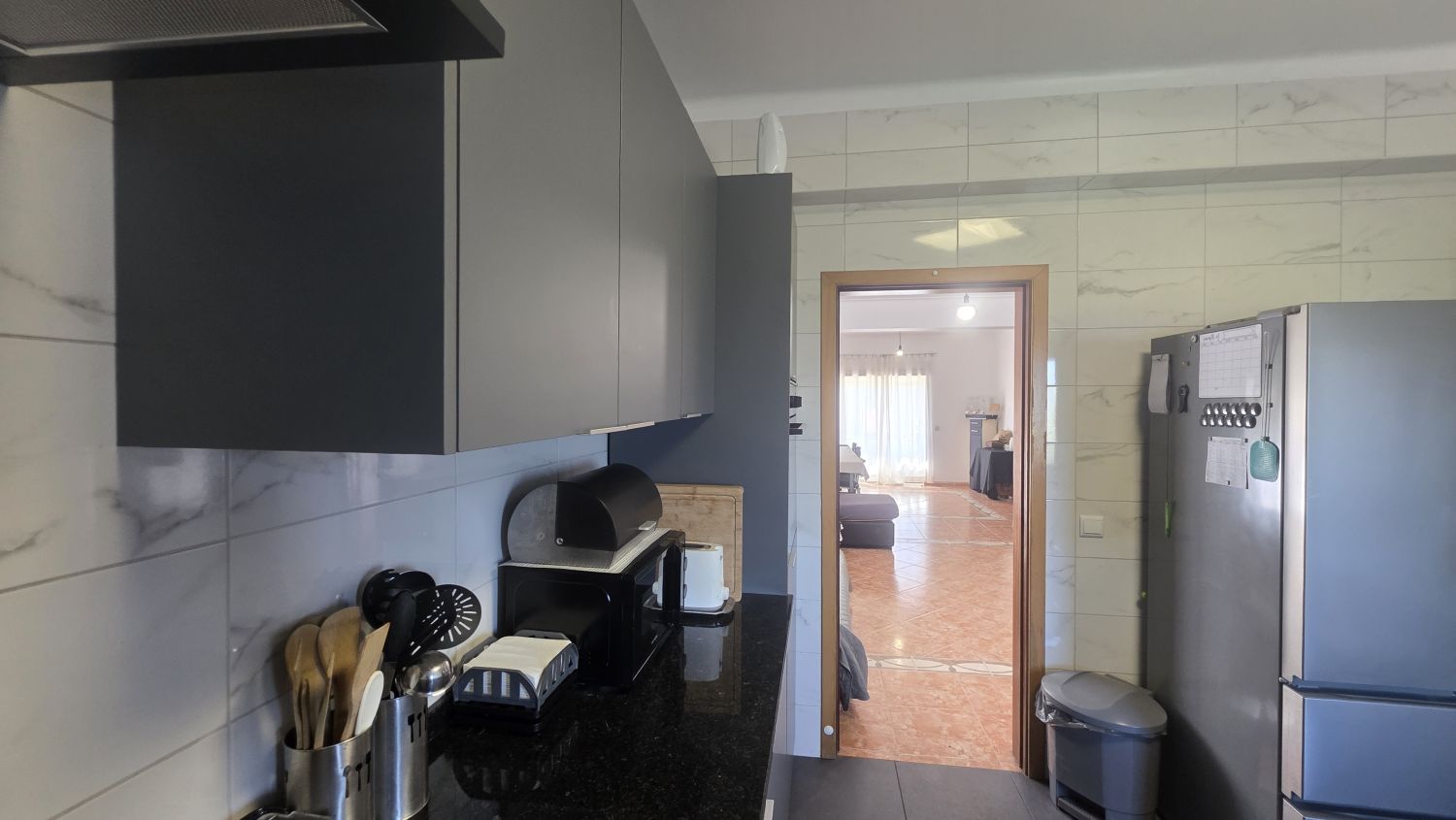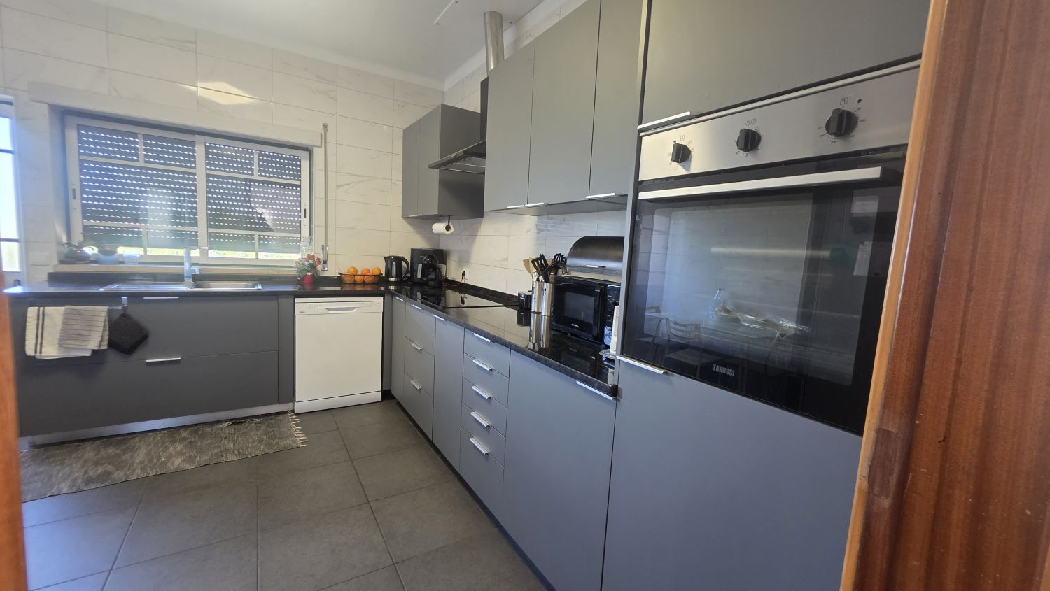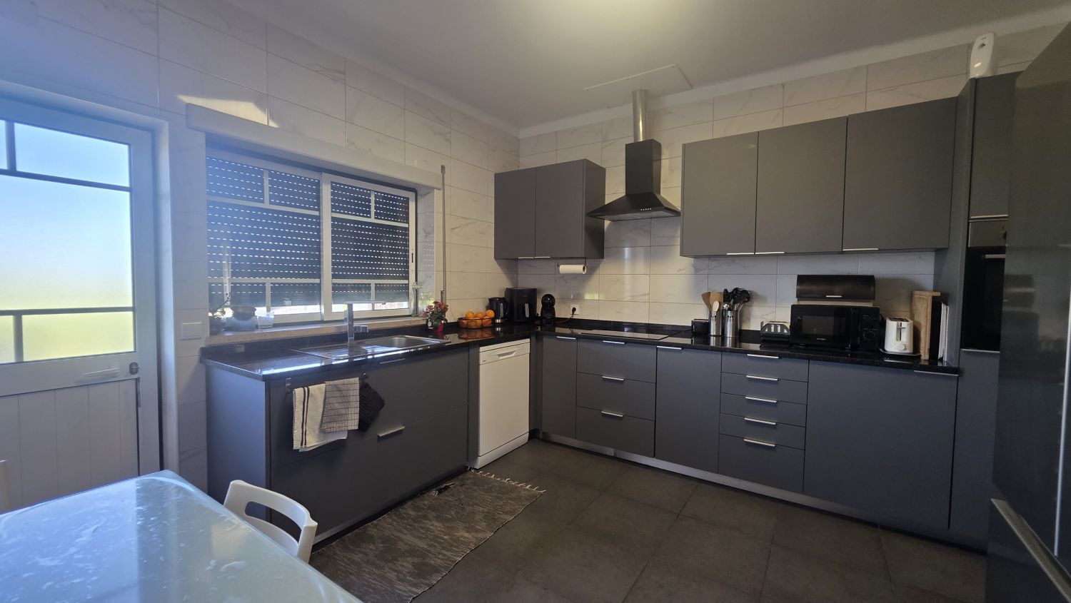 Na Cozinha tem uma bancada de boas dimensões, está equipada e tem acesso à varanda, com vista para o terreno.